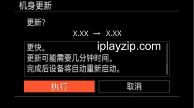 3.相机屏幕会显示更新前后的固件版本号,及升级注意事项。请在阅读之后,点击[执行],升级开始。